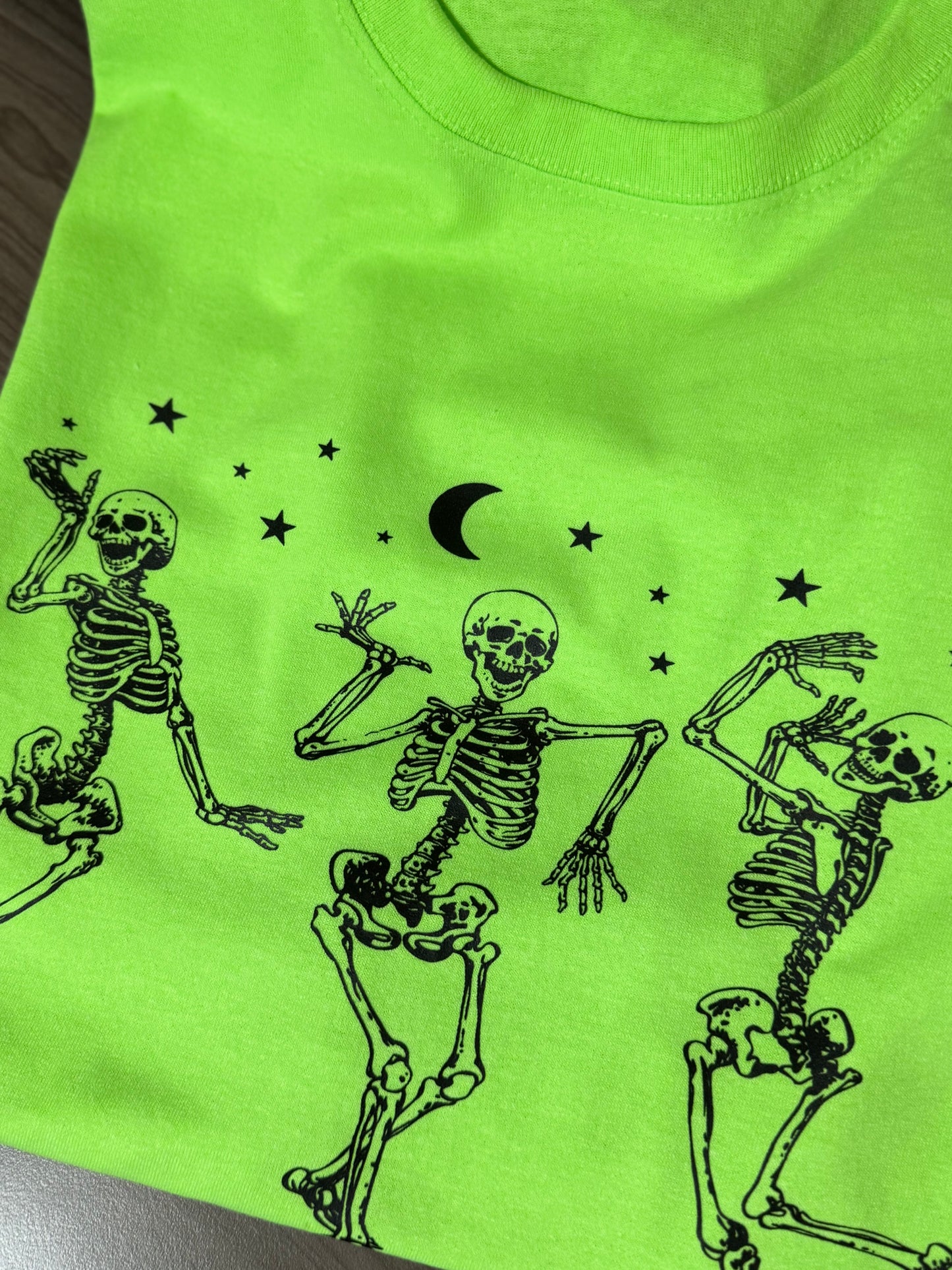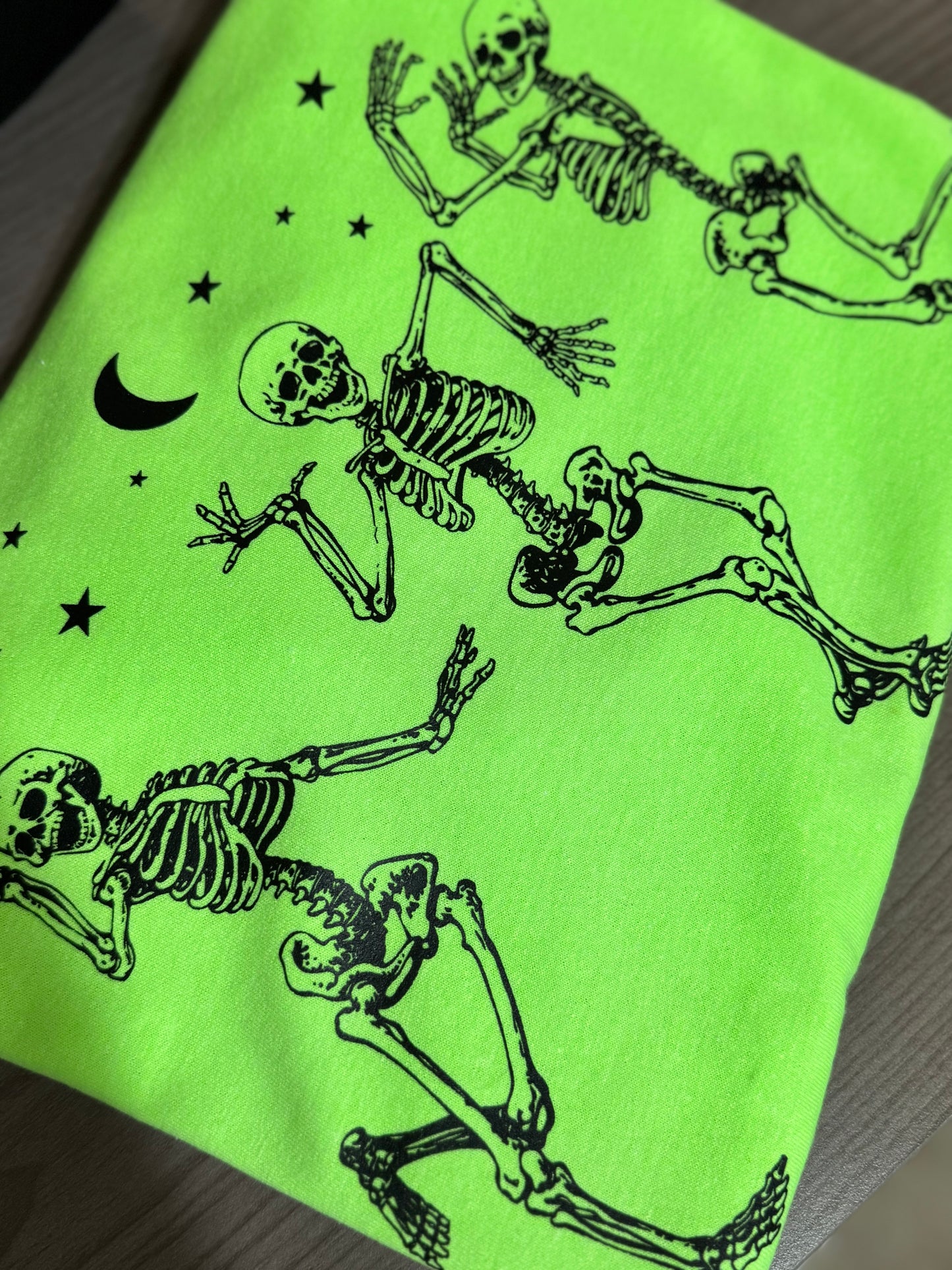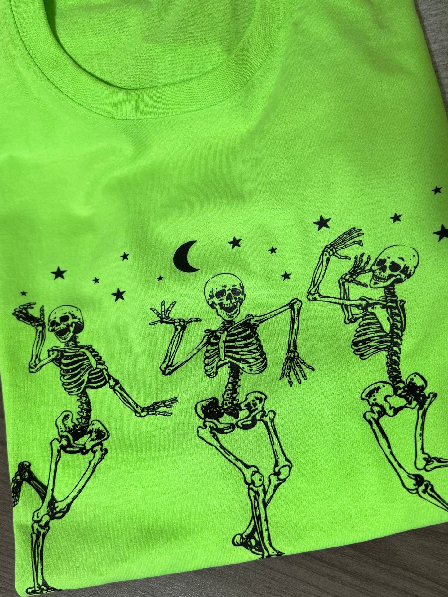 A design that will never miss, is dancing skeletons! I love the way the screen print in black looks on this lime green! Sometimes you need a POP of color!