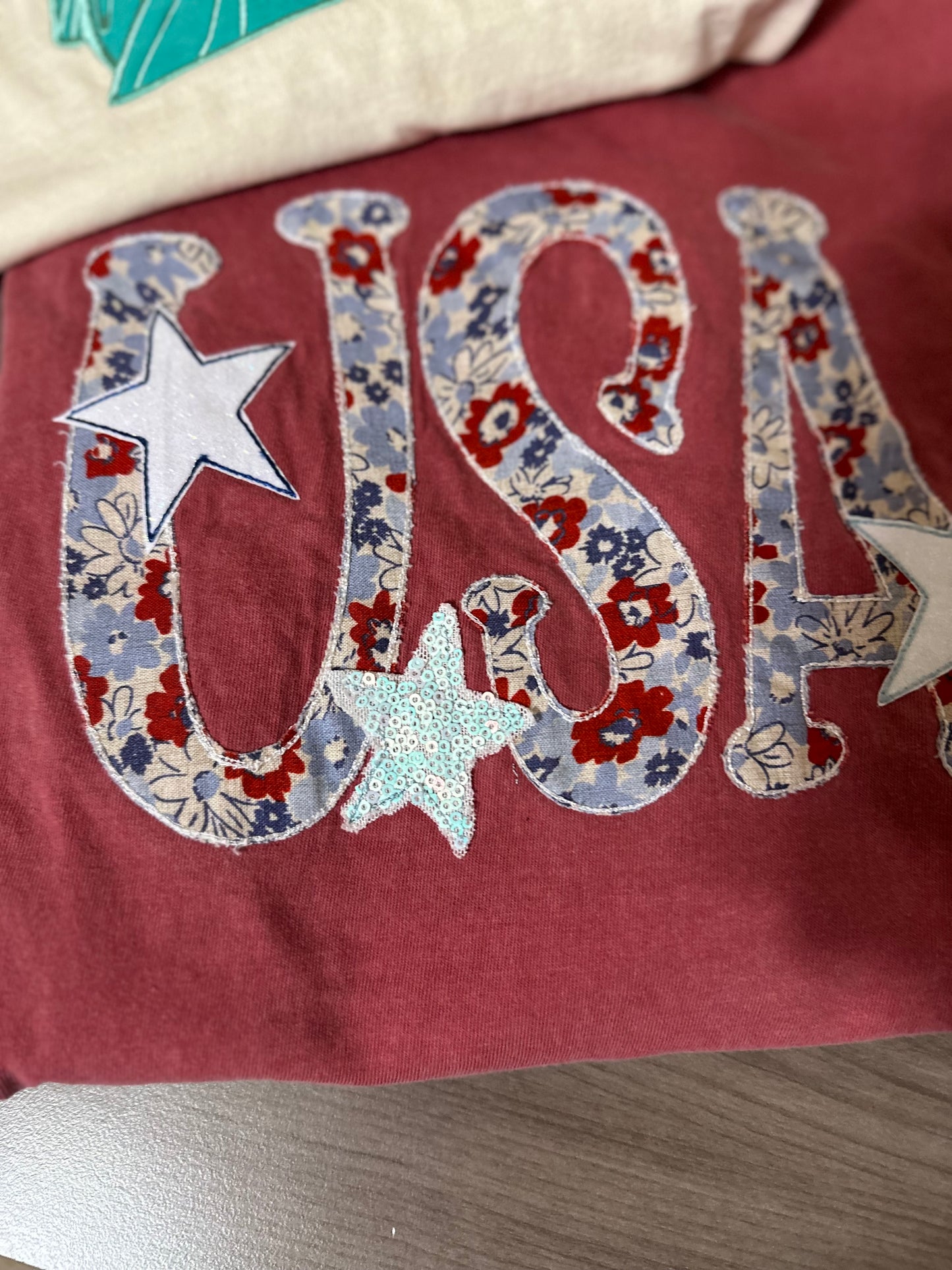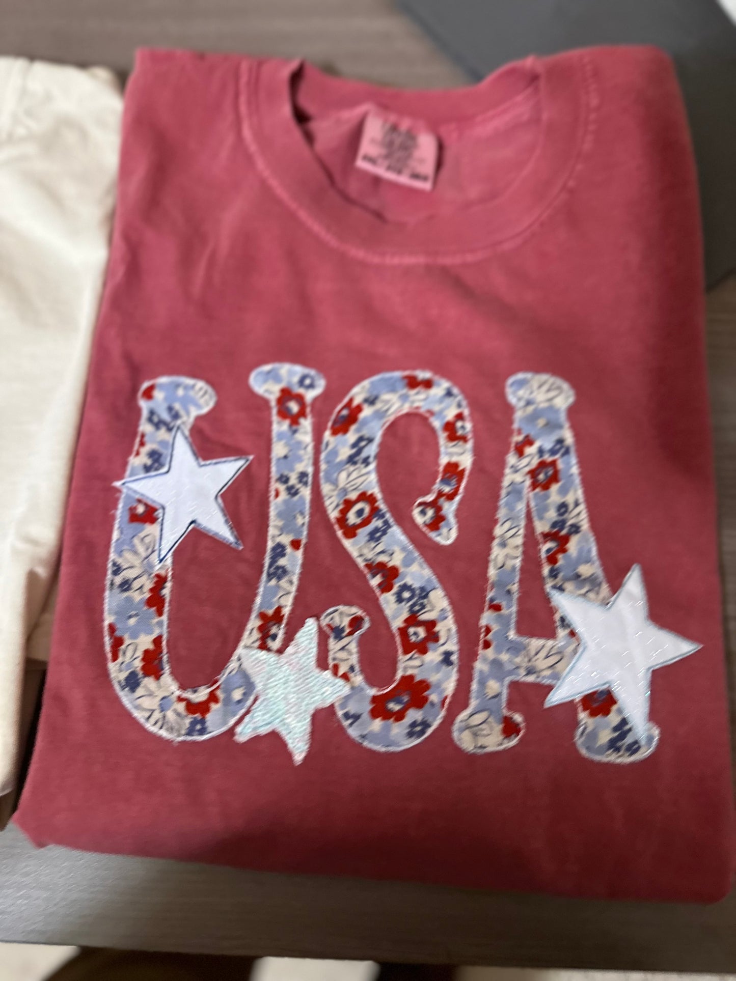This is made on embroidery machine with adding in patterned fabric for a fabulous look! 2 stars are white glitter and 1 is a sequin white fabric.