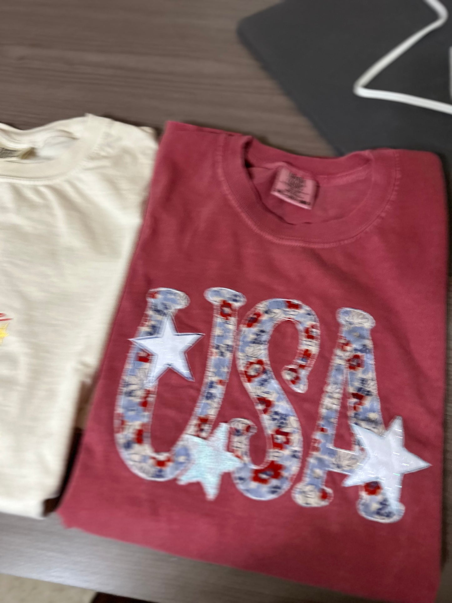 Brand of T is comfort colors in the color crimson. If you would like a different color please choose from the drop down in the options below. They are 100% cotton.