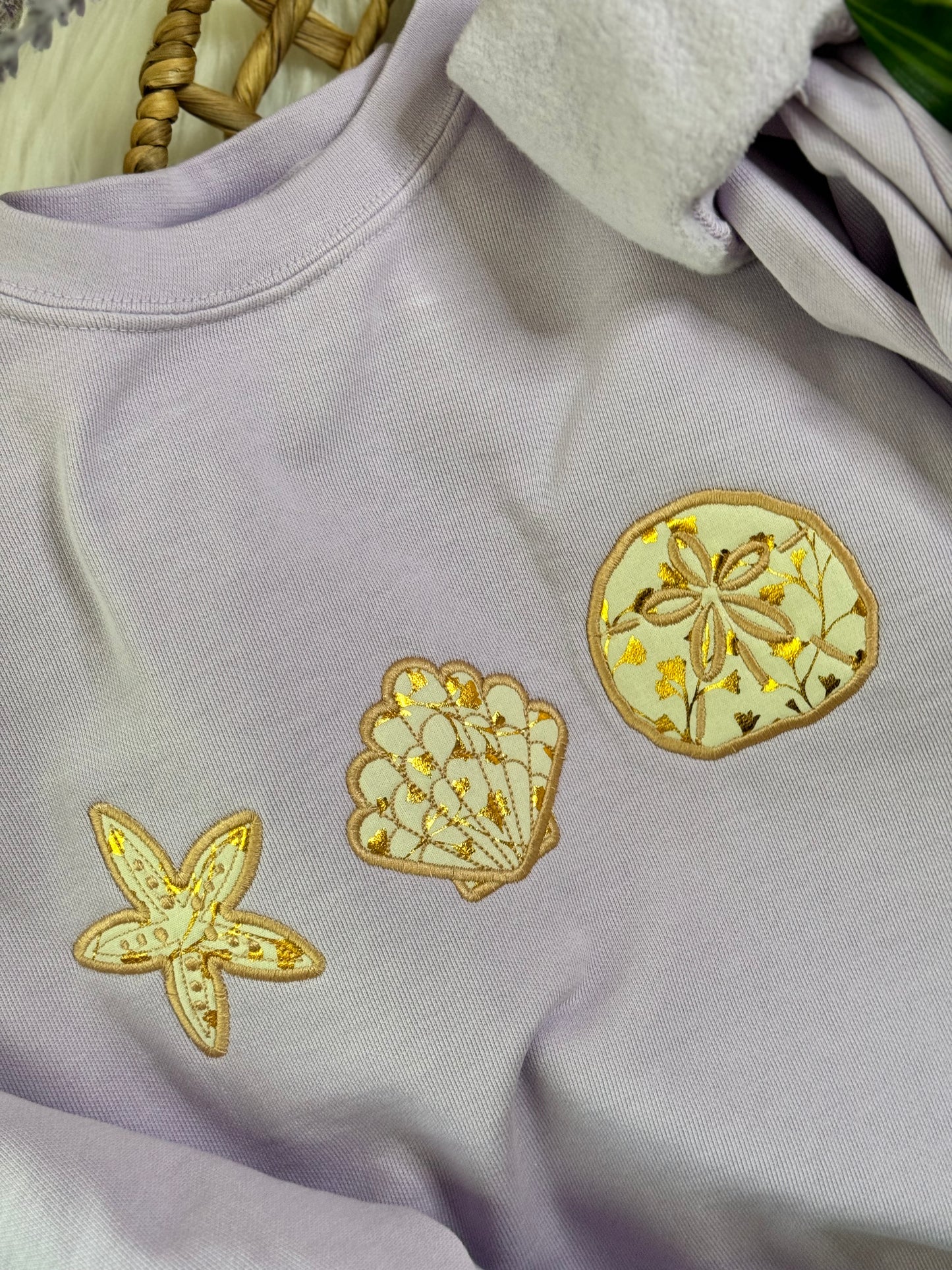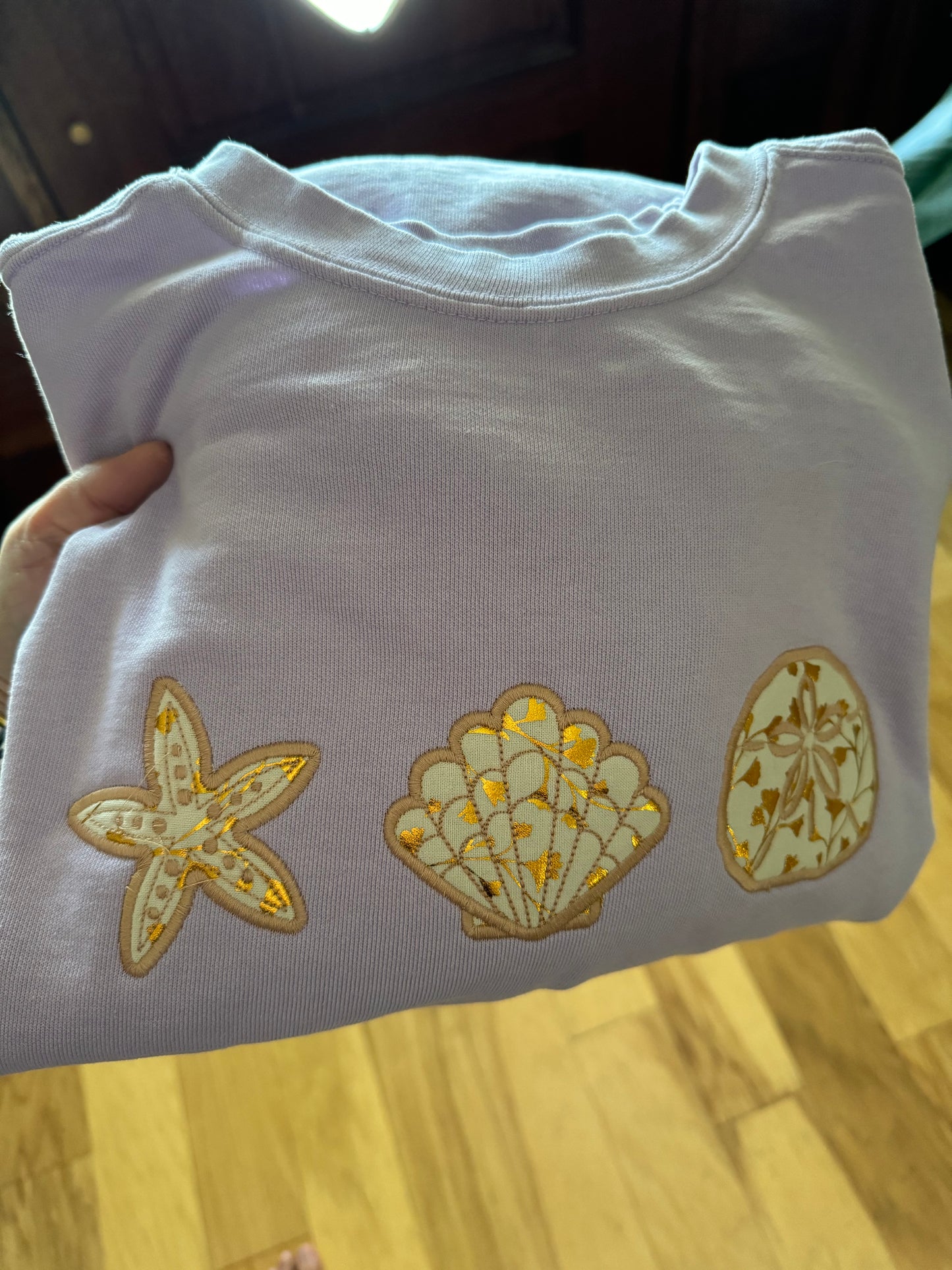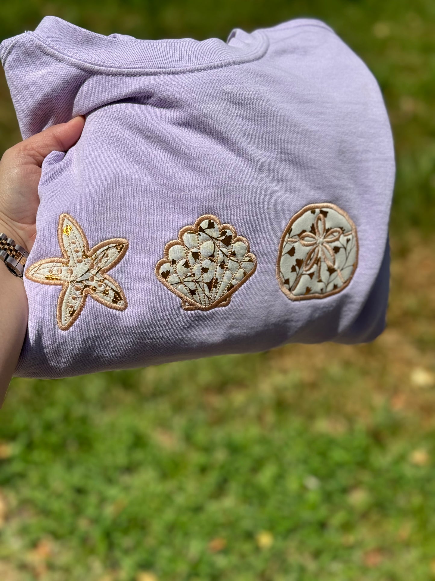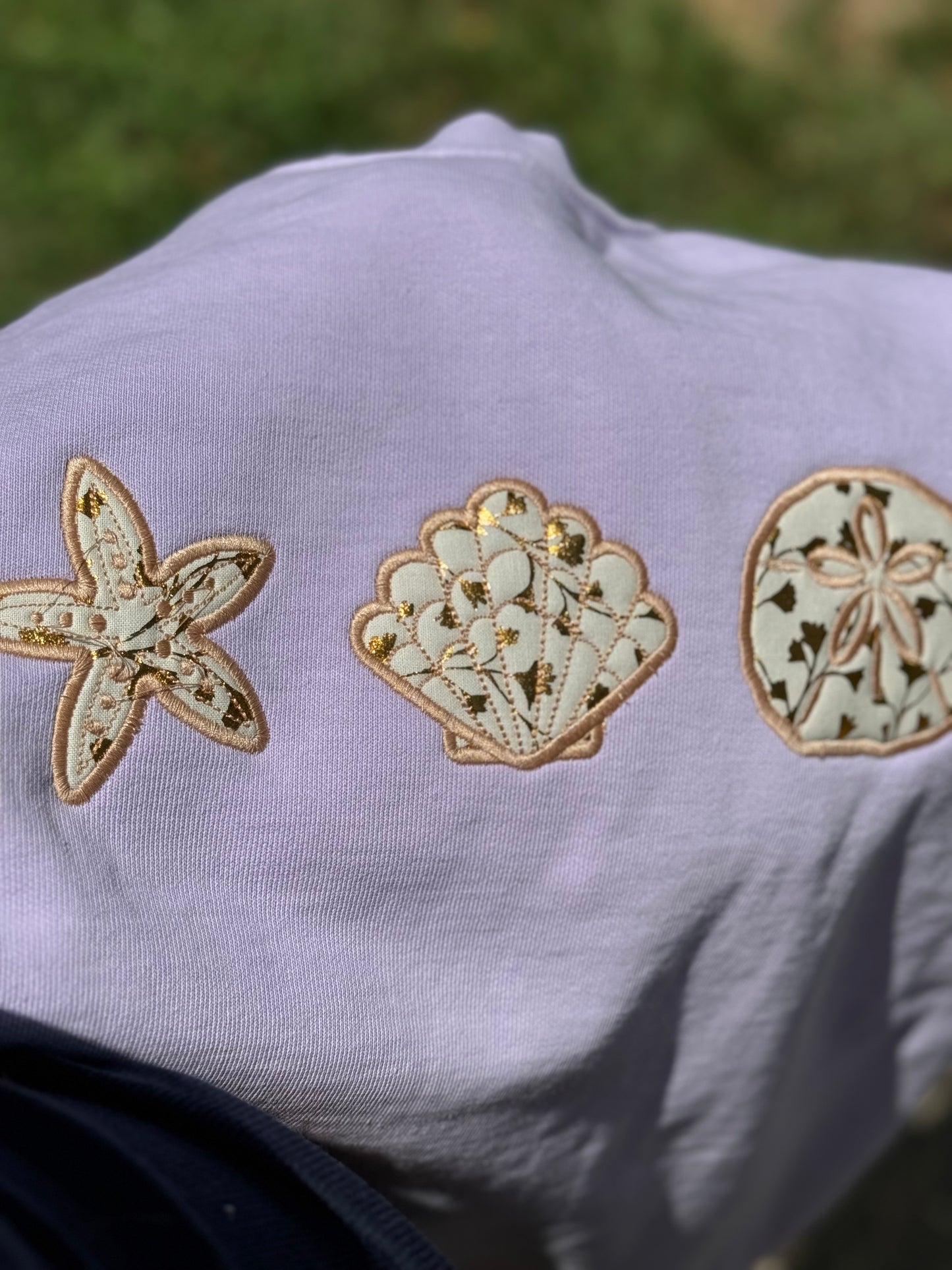 Who doesn’t love the beach and all the seashells and sand dollars along the beach?! I picked a neutral but somewhat vintage looking fabric for the appliqué seashells! It’s absolutely beautiful on this lavender crewneck comfort colors brand (you do have the option to get a "cheaper" option- still great quality, just a more traditional sweatshirt such as Gildan, Jerzee, or Hanes EcoSmart brand). If you do not want it on a crewneck, you can always choose from the drop down and select a t shirt or tank and the color of your choice! This is on a comfort colors sweatshirt in the color orchid which is a very light lavender color , but of course you can choose any color. All t shirts and tanks are comfort colors as well! YOU CAN ALSO REQUEST A DIFFERENT FABRIC AND THREAD COLOR ALONG WITH THE STYLE AND COLOR OF SHIRT/CREWNECK/TANK.